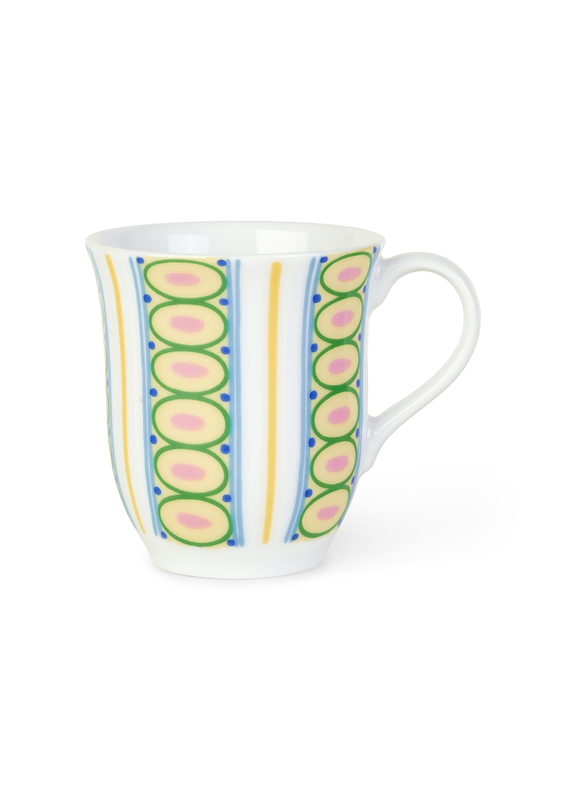 Hvis det på magisk vis var muligt at invitere Bjørn Wiinblad på en kop the eller kaffe, ville man være garanteret en masse gode historier fra den store verden. Alt andet end minimalistisk, Bjørn Wiinblads univers er både overdådigt, skævt, vidunderligt, i høj grad defineret af livlige farver og en unik stil. De finurlige og kunstneriske dekorationer kommer nu til udtryk på krus, hvor farverige, geometriske former med et håndtegnet præg blandes på kryds og tværs og alligevel fungerer forrygende sammen. Eva krus i gul har gule og lyseblå striber kombineret med grønne cirkler og prikker i lyserøde og mørkeblå. Mønsteret er inspireret af EVA-vasens forskellige kjoler, og farverne er holdt i de samme delikate nuancer, der kendetegner EVAs glade og venlige univers. Kruset rummer 35 cl – perfekt til en god kop kaffe eller the. Den kan roligt vaskes i opvaskemaskinen, når der er sjovere ting i livet end at vaske op i hånden. Hver enkelt krus har sin helt egen personlighed og farvepalette, men har stadig et tydeligt familieskab i kraft af Bjørn Wiinblads genkendelige streg. Eva krus pynter og skaber glæde både på bordet og på hylden, hvor det lyser op og gør hverdagen lidt mere farverig – præcis som Bjørn Wiinblad elskede det.