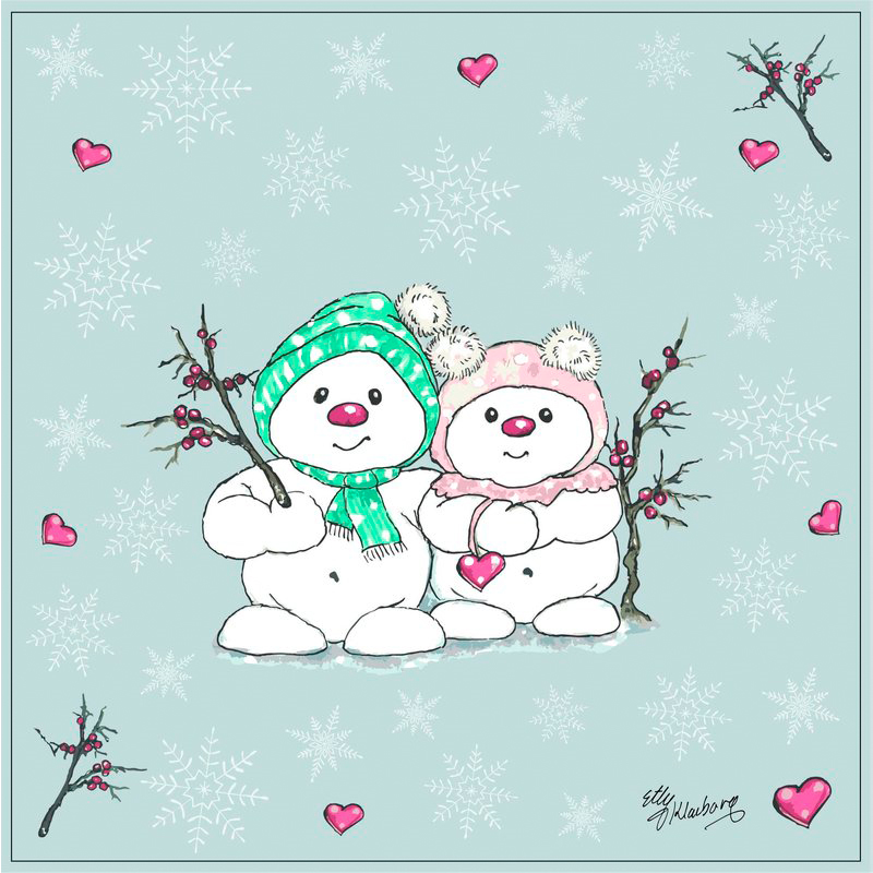 Etly Klarborg begyndte i 2014 at designe snemænd, hvilket blev en stor succes! Hun er derfor fortsat med at designe de nuttede og finurlige snemænd. Nu er snemands-kollektionen blevet udvidet til også at indeholde en akryldug, dækkeserviet og papirserviet – så nu kan der simpelthen dækkes det mest vidunderlige snemands-julebord. I motivet på denne søde dug finder vi snemændene Fiffi og Tilla fra 2018. Selvom snemænd er lavet af sne, så kan de altså godt fryse – derfor står Fiffi og Tilla tæt sammen for at få varmen i det frostklare vejr. Godt de har deres huer på!