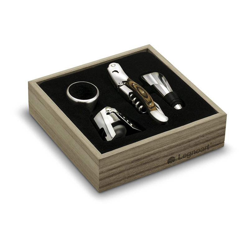 Dette eksklusive vinsæt med 4 dele er perfekt til vin-elskeren. I sættet får du en proptrækker lavet i træ, der ligger perfekt i hånden. Du får desuden en skænkeprop, en champagneprop og en dråbefanger, der alle er med til at løfte vinens kvalitet og give en perfekt oplevelse! Nyd et glas med en god ven eller veninde med dette kvalitetsæt fra Legnoart.