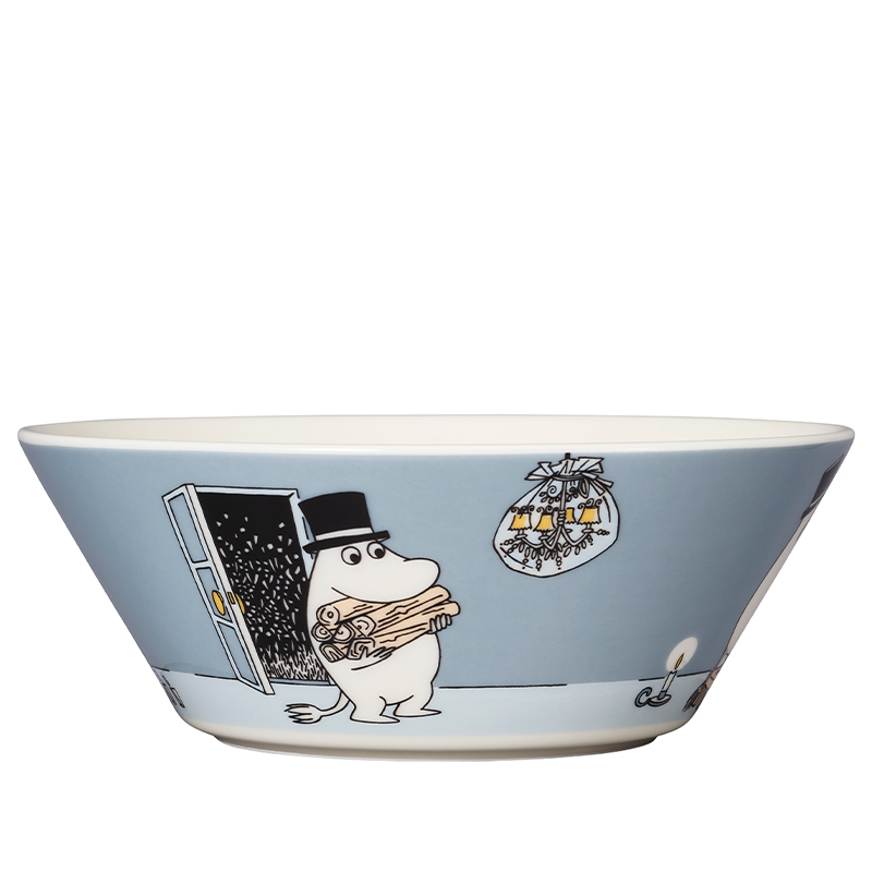 Byd velkommen til nye klassikere i Mumi-universet! På Mumi skålen og det tilhørende krus ses Mumifar, der er ved at forberede sig til vinteren i Mumihuset, hvor han sikrer at hele Mumifamilien kan holde sig varme vinteren over, når de er i dvale. Noget af det Mumifar gør, for at hjemmet er vinterklart, er, at han tildækker møblerne og lysekronerne med lagner for at forhindre dem i at blive støvede. Illustrationerne tager udgangspunkt i Tove Janssons tegneserie Mumivinter fra 1959. Farven på både krus og tallerken er en subtil grå, der danner en perfekt baggrund til Mumi illustrationerne, så de rigtig kan komme til deres ret. Mumi skålen er perfekt til havregrøden om morgenen eller til servering af snacks, slik eller måske endda en lille salat eller en omgang suppe.