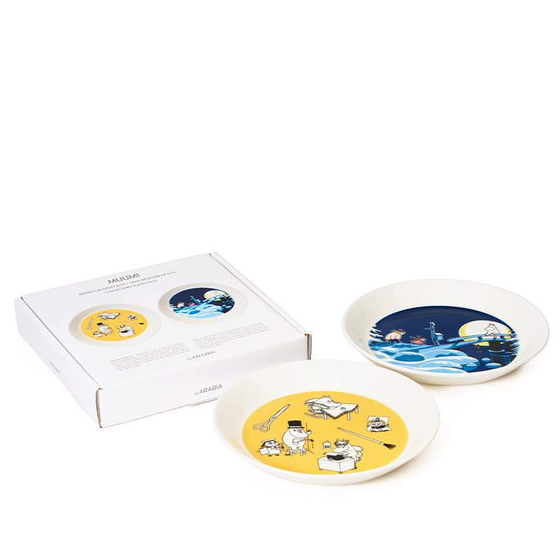 Dette sæt samler-tallerkner indeholder “Kontor” fra 1996 og “Vinternat” fra 2006. De to designs er baseret på Tove Janssons originale kunstværk, som Tove Slotte har fortolket i disse skønne tallerkener. Kontor tallerkenen har forskellige Mumi-figurer og illustrationerne er baseret på seks tegneserier af Tove Jansson. Den anden tallerken, Vinternat, udkom første gang i 2006 og forestiller Mymbles børn, der sniger sig ind på Mumi-mor. Moomin Collector’s Edition Plates 2022 2-pack: Office & Winternight – Arabia