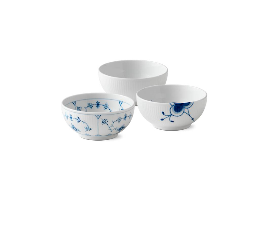 Sampak med 3 skåle 47 cl i de ikoniske Royal Copenhagen serier Musselmalet Riflet, Blå Mega Riflet samt Hvid Riflet