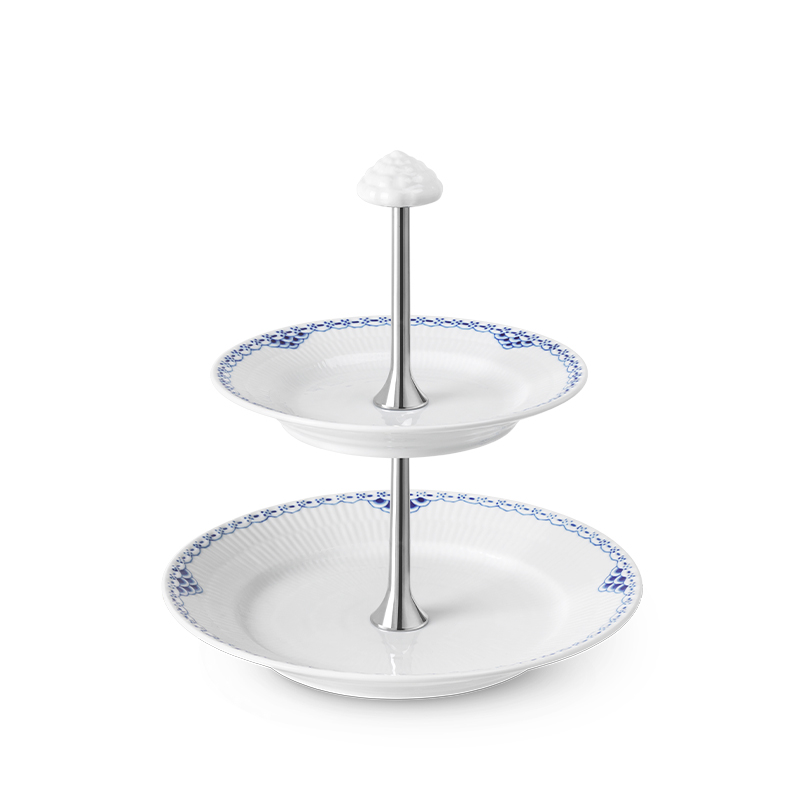 Denne smukke to-lags étagère vil skille sig ud på ethvert bord. Server frugt, morgenmad, ost, chokolade eller småkager på en elegant måde for dine gæster. Med tætte bånd til det klassiske musselmalede stel, blev Prinsesse-stellet skabt tilbage i 1978 som et testel. Men det blev hurtigt tydeligt, at dette elegante og feminine stel skulle være mere end blot et testel. Derfor er Prinsesse-stellet et fuldt middagsstel med alt hvad hjertet begærer.