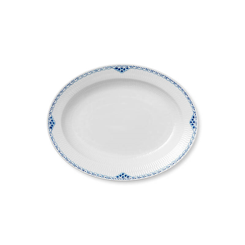 Royal Copenhagens Prinsesse Fad 36,5 cm er smukt, alsidigt og tidsløst. Serveringsfadet er hånddekoreret med Prinsesse-stellets elegante blondekant. Det er nemt at se det tætte bånd som Prinsesse-stellet har med det Musselmalede stel. Dette smukke Prinsesse fad kan nemt kombineres med andre Royal Copenhagen stel – kun fantasien sætter grænser! Med tætte bånd til det klassiske musselmalede stel, blev Prinsesse-stellet skabt tilbage i 1978 som et testel. Men det blev hurtigt tydeligt, at dette elegante og feminine stel skulle være mere end blot et testel. Derfor er Prinsesse-stellet et fuldt middagsstel med alt hvad hjertet begærer.