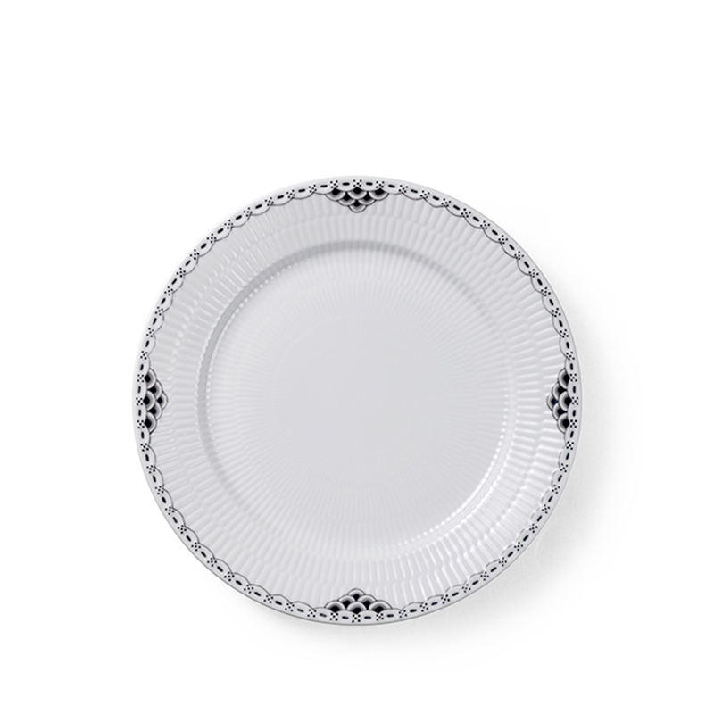 Denne hvid riflede tallerken med den yndige sorte blondekant, går smukt hånd i hånd og må siges at være underspillet elegance. Denne Sort Riflet Blonde serie er inspireret af Musselmalet Halvblonde tilbage fra 1888, som netop kendetegnes ved den smukt dekorerede blondekant. Denne frokosttallerken på 22 cm vil pynte frokostbordet til hverdag og til fest med uovertruffen elegance.