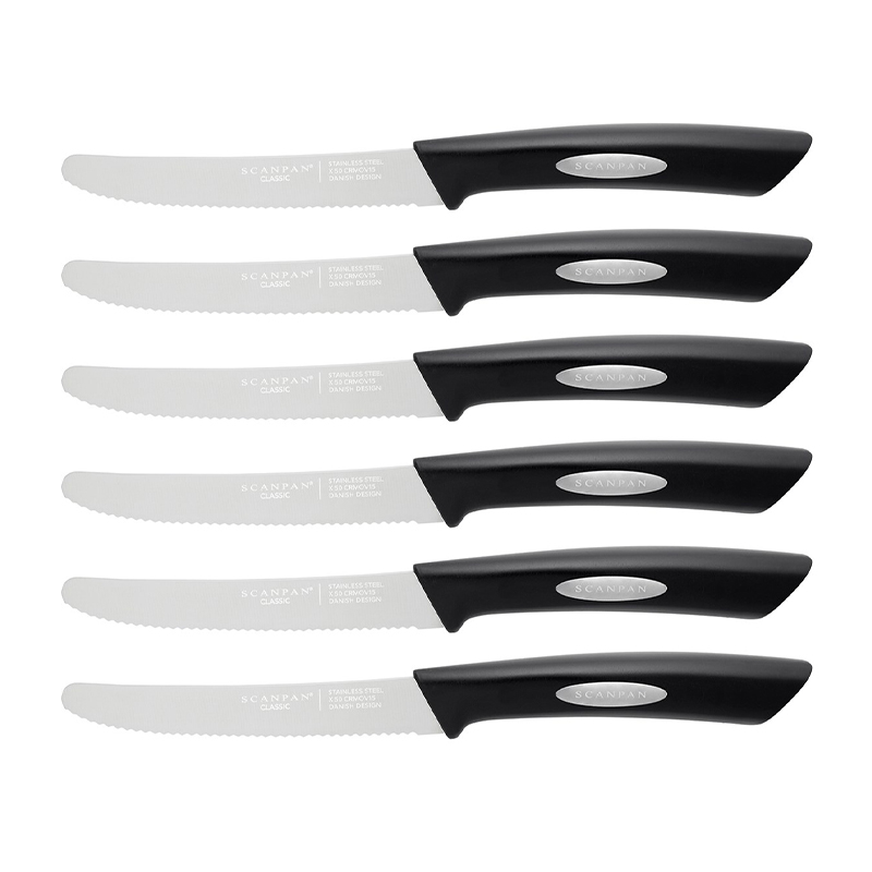 sæt med 6 stk. lækre grill/ steak-knive. Skærer nemt et gennem ethvert stykke kød, men er også god til at skære i råvarer med tykt skind såsom tomat og peberfrugt. Er også gode at smøre med takket være den runde spids. Scanpan yder 5 års garanti på dette produkt.